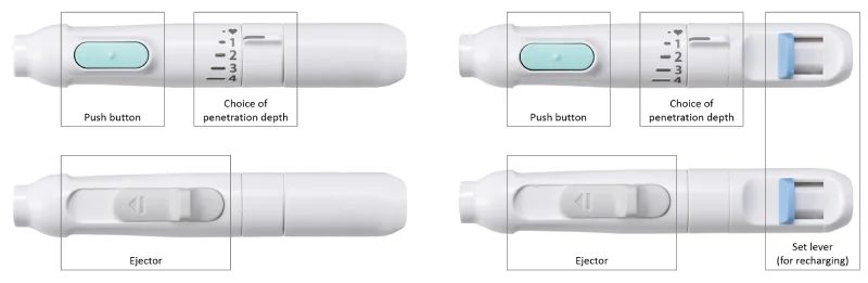 If the push button is pressed accidentally, the set lever can be pulled to make the released lancet usable again.